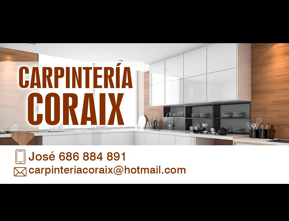 Carpintería Coraix, muebles, cocinas, armarios, vestidores, aseos, puertas, tarimas flotantes y mucho más a medida y totalmente personalizables. Llámanos al y pregunte sin compromiso 686 884 891 o mande un correo a carpinteriacoraix@hotmail.com preguntando cualquier duda.